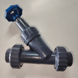 Vanne à siège incliné diamètre 25 mm PN16 à coller femelle avec deux union démontable à chaque sortie de marque hidroten..